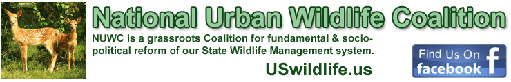 Reform of today's "hunting" policies has nothing to do with our 2nd amendment. It simply is not 1950 anymore and our wildlife must be managed accordingly. Urban Wildlife refers to native wildlife that is able to live or thrive in urban environments - our backyard wild animals and all wildlife native to the USA. The people, organizations and collective members of this Coalition represent a public majority of wildlife enthusiasts that appreciate the intrinsic value of all wildlife, sporting individuals or not. We, the People, hereby seek reform and imperative restructuring of the State Wildlife Management Institution policies and agendas. NOTE: The National Urban Wildlife Coalition is also known today as "National Wildlife Management Reform Coalition". How is NUWC Wildlife different from an animal activist organization? NUWC is neither "pro" nor "anti" animal welfare, animal rights, or hunting. It is a citizen sector organization (grassroots coalition) of people interested in the myriad of issues that affect the wildlife in our country. Changes in socio-political values have resulted in more stakeholder groups who want to be included in wildlife management decisions today than at any other time since the advent of applied wildlife management in North America. Although public attitudes and beliefs regarding wildlife have always been dynamic, public interest in wildlife and desire for input into management of wildlife have increased since the early 1970's. Note: State Wildlife Agencies have various names. Yours may be titled Fish & Game (F&G, or F&W), Department of Natural Resources (DNR), Department of Environmental Conservation (DEC), etc. For simplification we use the acronym for a universal description of State Wildlife Management/ Agency = SWM or SWA. Why Wildlife? Few are aware that our nations wildlife is controlled almost entirely by state agencies. These state wildlife management (SWM) agencies do not function in a democratic manner representing all interests such as wildlife watchers, hikers, citizens concerned for animal welfare, environmentalists and sportsmen. Our state agencies arbitrarily create policies that almost exclusively further the interests of the hunting public. This undemocratic system has evolved largely due to the fact that SWM agencies are funded by gun tax proceeds; funds that are primarily hinged on the quantity of hunting licenses sold each year. Therefore our state agencies work to serve the interests of hunters, to sustain gun sales, to purchase and maintain public lands for hunting, and to control wildlife populations in methods that result in questionable management of our wild animals and environment. Who are We? We are an alliance of interested parties for joint action. We believe in the concept of power in numbers to effect change in our democratic society. Those concerned about today's wildlife management find it has evolved into an industry dominated and controlled by special interests; groups with policy influence that many people disagree with. Please see our MISSION page for further information, and join us to make our united voice louder.